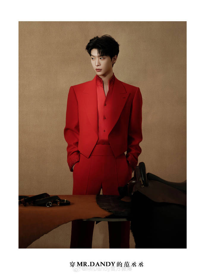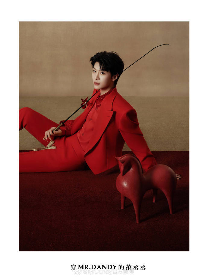 从细节来看,这套西装的设计确实花了不少心思。短款剪裁利落又显高,对于想要优化身材比例的男生来说堪称教科书级示范。正红色调明艳却不扎眼,面料在舞台灯光下泛着细腻光泽,既有节日的热闹感,又不会显得过于浮夸。Mr.Dandy作为圈内知名的定制品牌,这次为范丞丞打造的这套look,完美结合了他本人的少年感和西装的正式感,难怪会被网友称为“新年战袍天花板”。